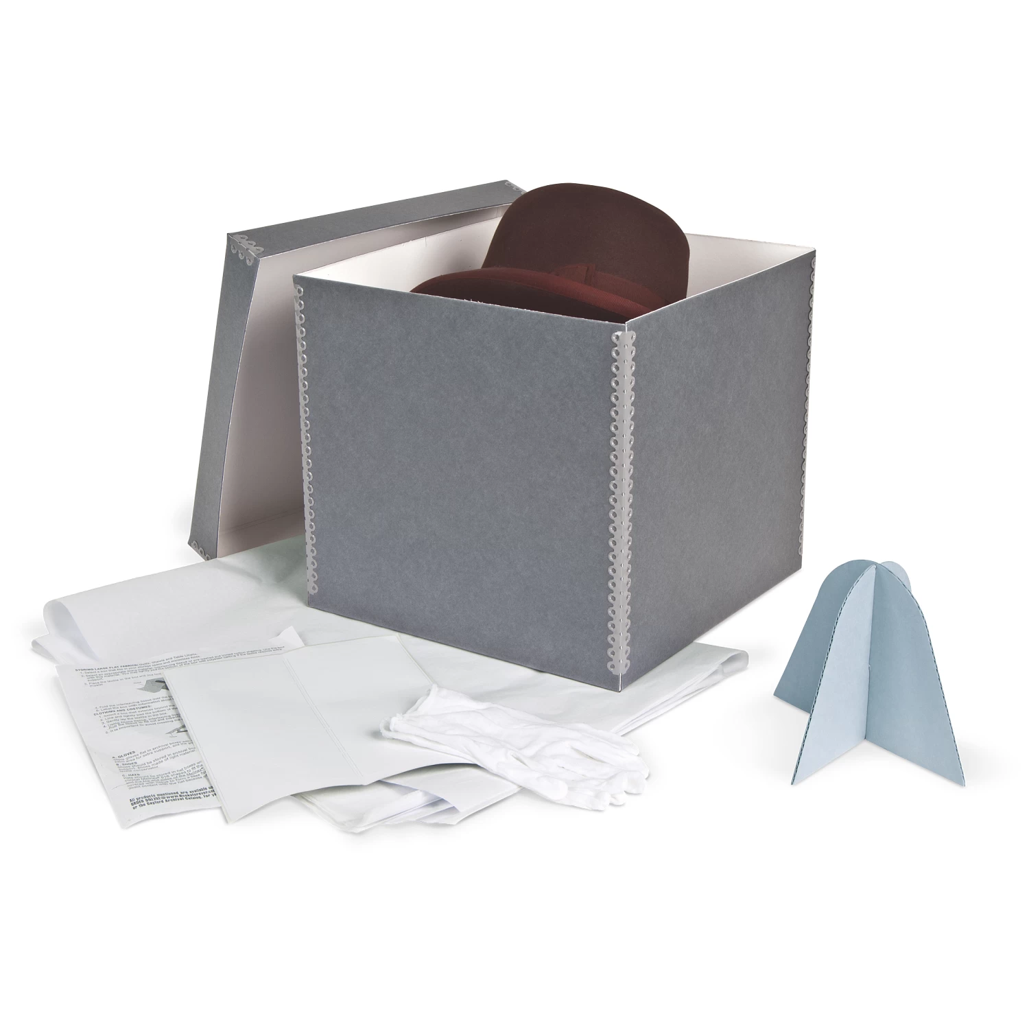 - Includes box, hat mount stand, 25 sheets of 10 x 15″ unbuffered tissue, white cotton gloves and labels to identify contents