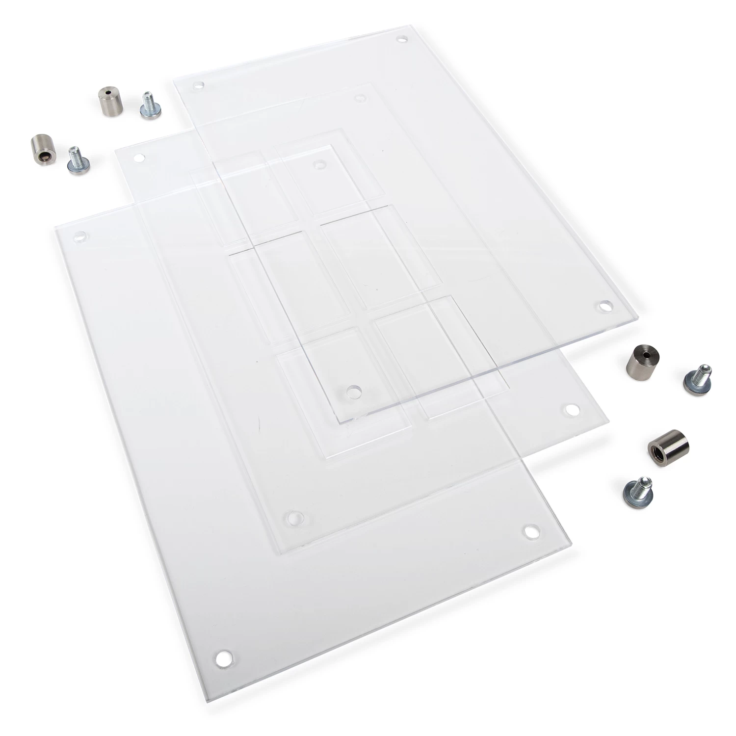 - Includes four stand-offs, solid acrylic back panel, acrylic mount with six cut-outs and UV-filtering front panel