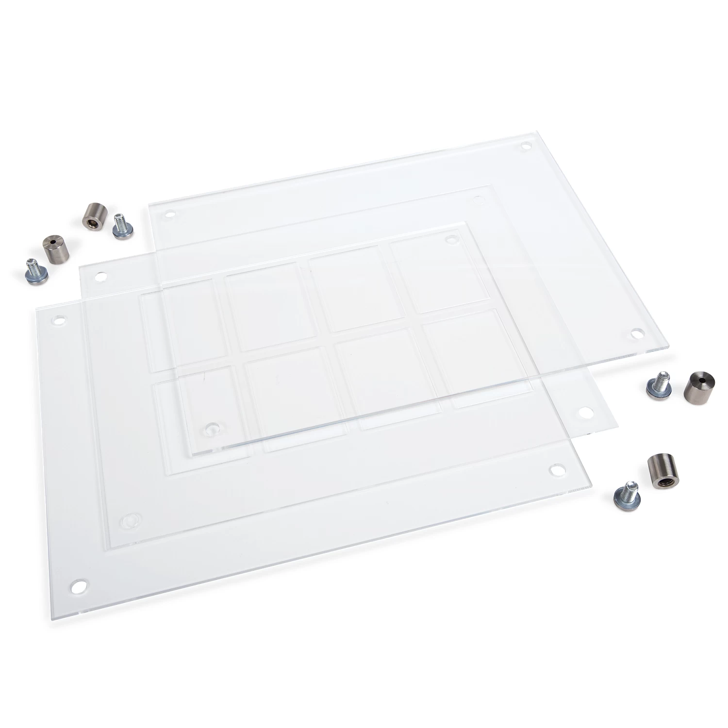 - Includes four stand-offs, solid acrylic back panel, acrylic mount with eight cut-outs and UV-filtering front panel