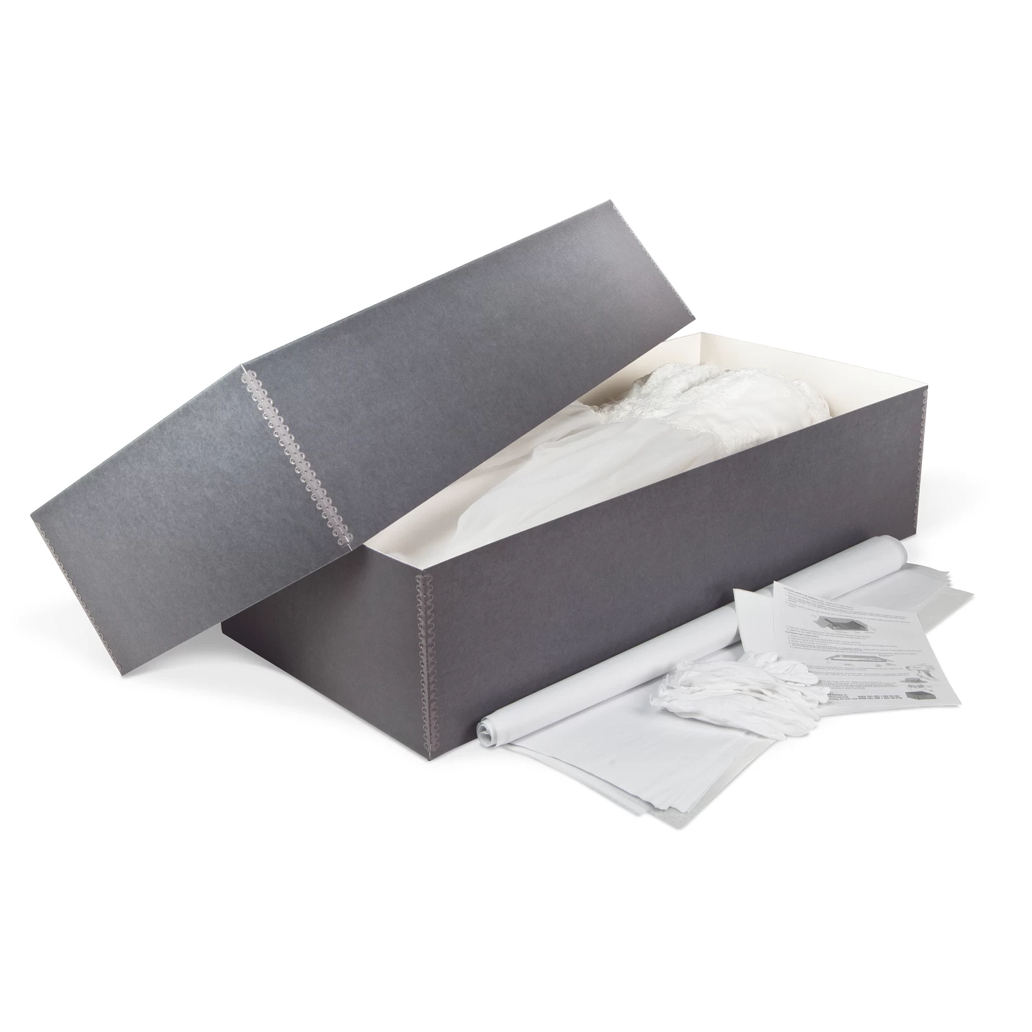 Our Gaylord Archival® Unbuffered Blue/Grey Barrier Board Extra-Large Costume & Dress Preservation Kit has everything you need to safely store important and vintage costumes, wedding gowns and other garments. Storing garments in a box instead of on hangers prevents them from becoming misshapen. The box features metal edges for reinforcement and includes acid-free, unbuffered tissue paper, cotton gloves and instructions for preserving gowns.