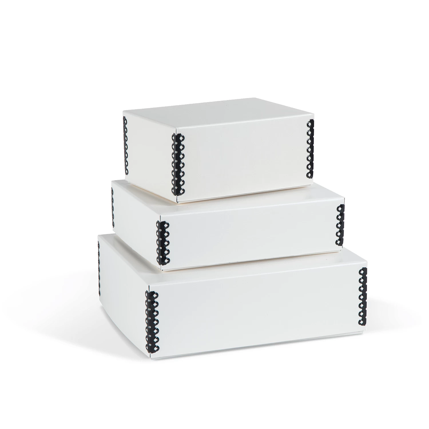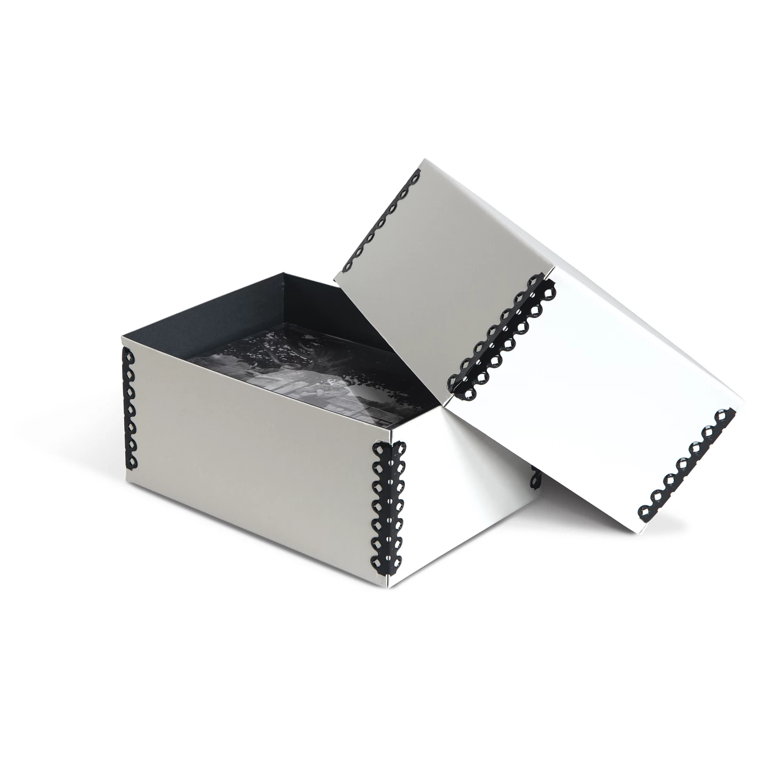 Safety store your photographs and prints in this Gaylord Archival® White Barrier Board Print Box. The deep lid protects the contents from potential damage from dust and light. The sleek black metal edging adds support to adhesive-free corners. The DuraCoat™ acrylic coating protects the box from moisture, fingerprints and abrasion.