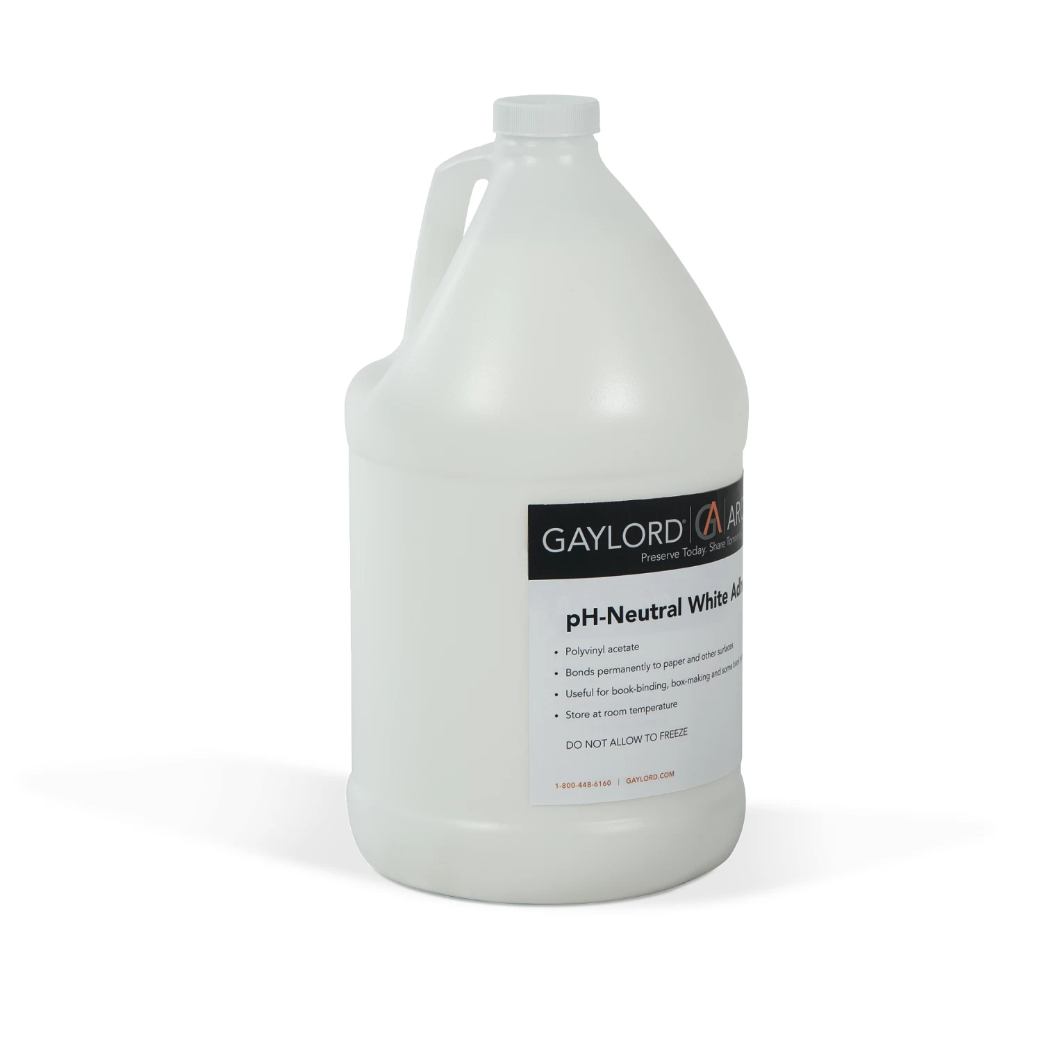 Gaylord Archival® White pH Neutral Adhesive (1 Gallon) is formulated for use with preservation materials but can also be applied to general uses. The PVA adhesive dries clear, stays flexible and cleans up with warm water. It will not turn yellow, become brittle or discolor paper and other surfaces.