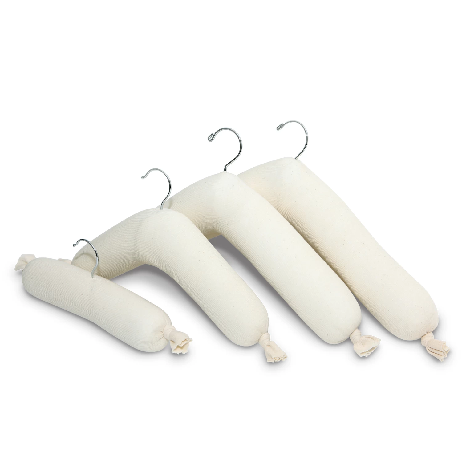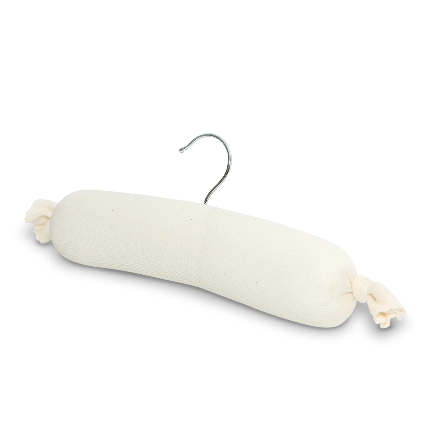 Handmade by a professional collections manager, the Hangerbee Wooden Core Padded Hanger with Chrome Hook is ideal for long-term storage of uniforms, costumes, wedding dresses and other valuable garments. Made from a solid wood core padded with polyethylene padding and 100% polyester needlepunched batting, wrapped in 100% cotton stockinette that has been prewashed with artifact-safe Orvus soap. Hanger features a chrome swivel hook.