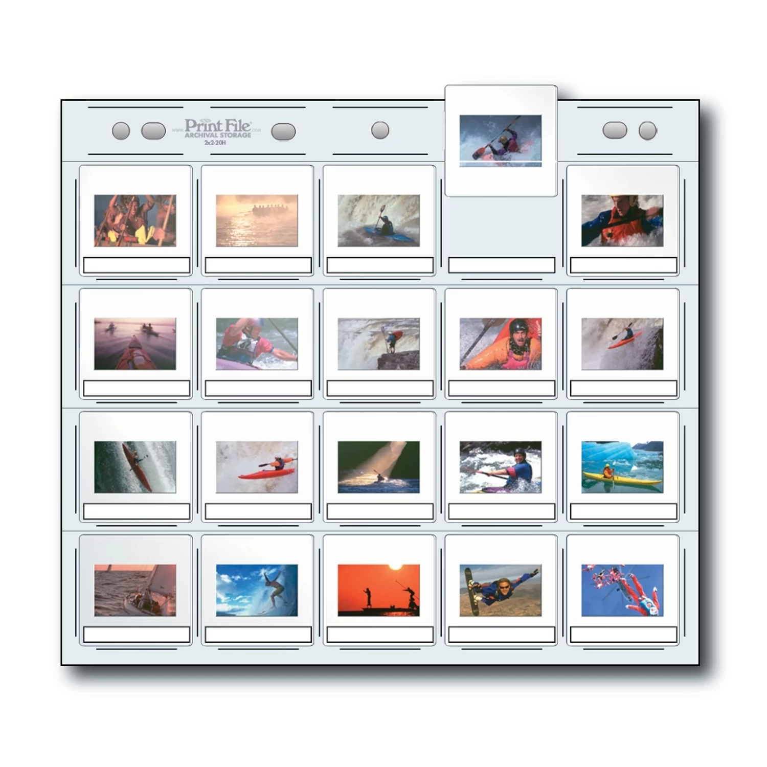 Organize and index your slide collections in clear, inert Print File® 4 mil Polypropylene 35mm Slide Pages with Date & Subject Blocks (100-Pack). The pages are 3-hole punched for binders or albums and feature a preprinted edge strip for writing the date and subject. A white date and subject block beneath each pocket lets you identify slides individually.