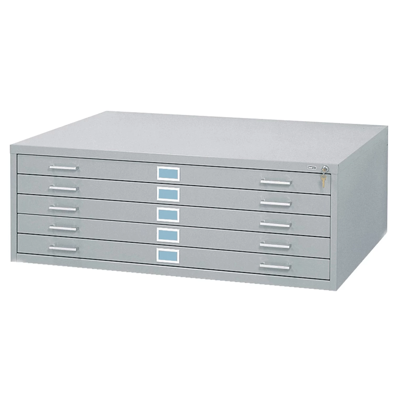 Protect a variety of flat media with the Safco® Horizontal 5-Drawer Flat File for 30 x 42″ Sheets. It features welded steel construction with double thick wraparound corners and sturdy inner frame supports for stacking strength. The powder-coated finish will not off-gas for safe archival storage. Drawers feature positive closures that keep them tightly shut, as well as courtesy stops that keep drawers from rolling when open.