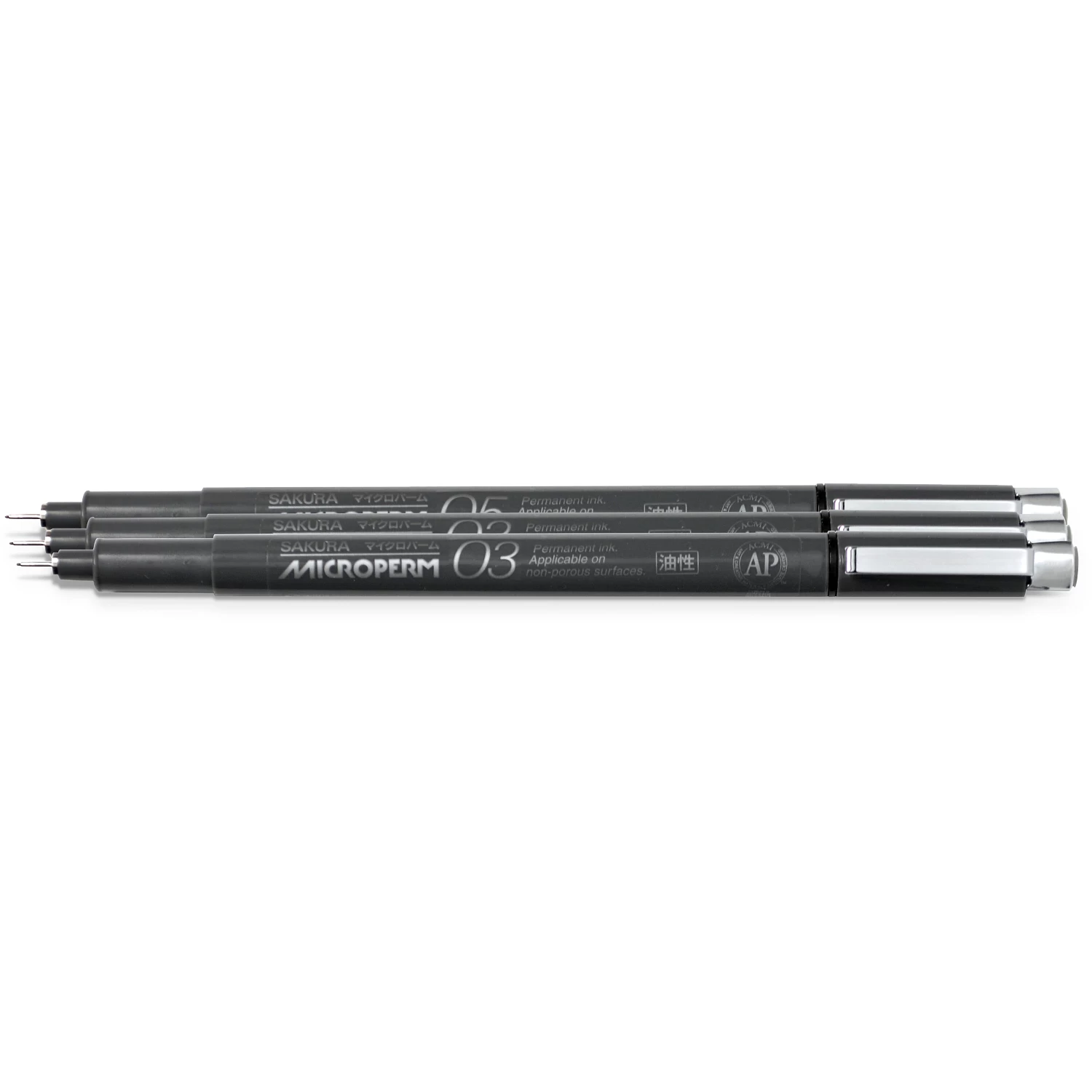 The Sakura® Microperm® Pens (3-Pack) are used to make precise marks in micro-spaces or on unusual or challenging nonporous surfaces. The chemically stable, waterproof ink can be used on glass, film, diamonds, wood, cellophane, CDs, plastic, metal and more. The ultra-fine line nib has a protected tip that will never split. 3-Pack includes one each: Point 01: 0.25mm, Point 03: 0.35mm, Point 05: 0.45mm.